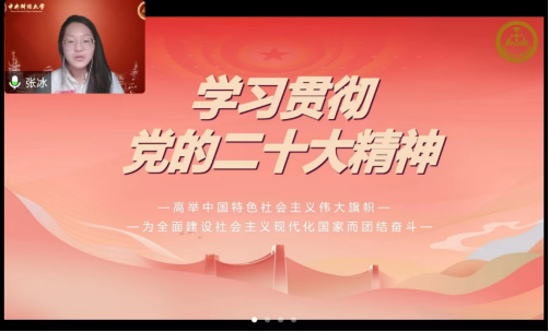 研究生讲师团张冰以党的科学理论与专业学习相结合的角度,全面贯彻落实习近平新时代中国特色社会主义思想和党的二十大精神,以习近平经济思想为指导,回顾了十年来我国经济金融领域的非凡成就,分析了我国经济金融领域面临的新形势和新挑战,对未来的金融行业发展进行了展望。