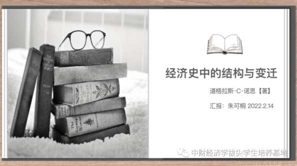 接着,朱可桐同学分享了新经济史学派的经典著作《经济史中的结构与变迁》,道格拉斯·诺思教授在本书中结合计量经济学的新技术、以新古典理论为基础,结合交易费用理论,从产权与激励、制度变迁的视角对人类社会历史的发展进行了解读和阐释,提出了制度创新与制度变迁对经济增长起决定作用的观点。朱可桐同学首先介绍了新经济史学派的发展脉络以及诺思教授在研究方法上的创新。随后,介绍了构成本书核心理论——制度变迁理论的三个基石,即描述一个体制中激励个人和集团的产权理论、界定实施产权的国家理论、与影响人们对‘客观’存在的变化不同反应的意识形态理论。最后,通过了解诺思教授在解读人类历史上第一次经济革命如何发生(人类社会生产生活方式从采摘捕猎转向农耕畜牧)时的分析过程,大家一同体会本书的独特视角。研究经济增长的源泉一直是经济学家的兴趣和挑战所在,《经济史中的结构与变迁》无疑在这一问题上做出了有益且重要的探索,丰富了我们的研究视角与思路,是值得阅读的经典著作。