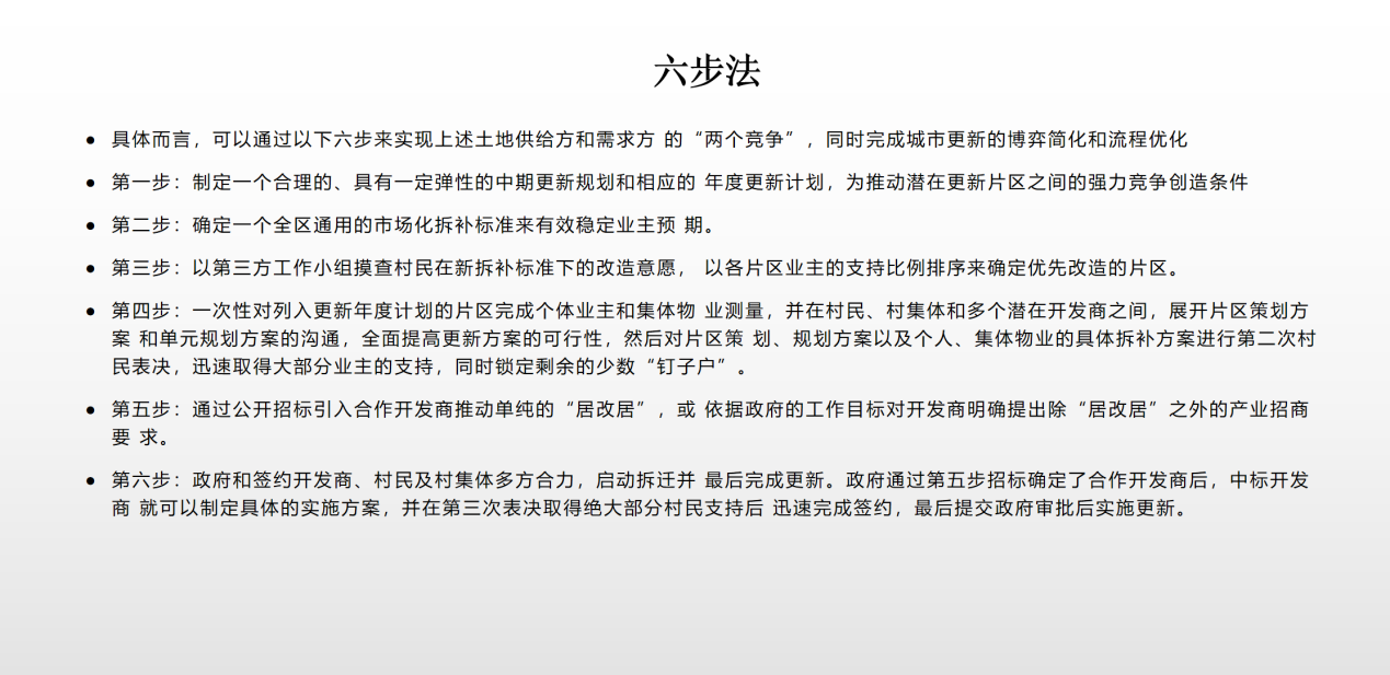 最后,黄琛然和孙诗洋同学介绍了本书的第八章,主要探讨以城中村和城市老旧小区为主要对象的城市更新,提出通过创新模式来突破既有更新困局。为解决这些问题,提出了“两个竞争加一个腾挪”的模式,包括制定更新规划、确定拆补标准、摸查意愿、规划决策、招标开发商和合力更新等步骤,还包括“单纯居改居模式”和“旧村居改造加招商引资协同模式”两种类型。同时,要通过空间腾挪,如利用一般农田等创造有效空间,提高旧改效率。在中国现实中,城市更新是发展的必然需求。应积极推广创新模式,加强规划体制创新,简化审批程序,确保第三方工作小组的独立性。通过这些措施,能够有效加快城市更新速度,实现产城融合,提升城市品质,为居民提供更好的生活环境。