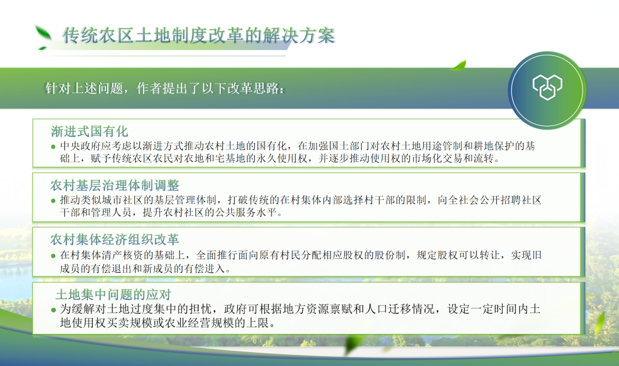 随后,夏必川和刘先富同学介绍了本书的第五章——传统农区土地改革的局限和进路,主要分析我国传统农区的土地“三权分置”改革,考察传统农区土地改革的已有进展、局限及未来出路。本章涵盖我国农地产权制度改革的演进与现实挑战,目前三权分置改革所遭遇的现实困境,与传统农区土地制度改革的解决方案等诸多内容。本章深刻体现出改革的复杂性,需要平衡土地的经济效益与社会公平,既要保障农民的权益,又要实现土地的高效利用。同时,改革应注重渐进性和可操作性,避免一刀切,充分考虑各地的实际情况。除此之外,还应当用均衡的视角去看待农地改革,统筹考虑城乡发展、资源环境保护和社会公平正义等多重目标,确保改革的成果惠及全体人民,提升共同福祉。