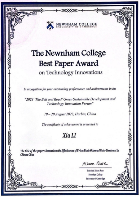 中心研究生李霞博士执笔,中国环境科学研究院流域中心高红杰副主任、流域中心流域水生态保护与修复研究室袁鹏主任及中心研究部刘倩主任、开云kaiyun体育财经研究院李珊珊副研究员共同合作完成的研究论文《Research on the Effectiveness of Urban Black-Odorous Water Treatment in Chinese Cities》,在“2023一带一路绿色可持续发展与科技创新论坛”上获评杰出论文奖。李霞博士到场宣讲论文,并接受点评和颁奖。